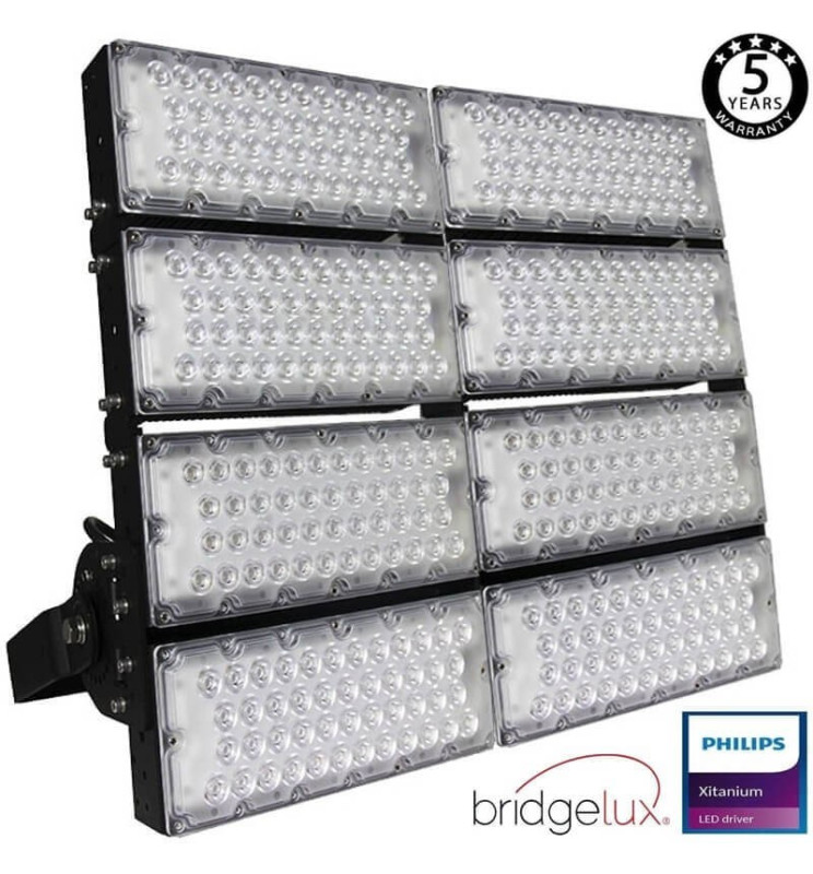 Rated Power960W Nominal Voltage85-265V Colour5000K CRI – Chromatic Rendiment Index85 Construction MaterialAluminiun+PC Luminosity-Lm192000 Lm Number & Type of LEDsSMD 5050-12D BRIDGELUX CHIP 2240 BXCD DS-C47 Beam Angle (º)20º – 40º – 90º Luminous diodo LED (Lm/W)240 Lm/W Luminous Efficiency (Lm/W)200 Lm/w CertificationsCE – ROHS IPIP65-Outdoor Diode Life Expectancy (H)50.000 Dimensions (mm)615x500x330mm Power Factor (PF)0,98 Frequency (Hz)50/60Hz Temperature Range (ºC)-20°C ~ +55°C On/Off Cycles100.000 Starting Time (s)0,2s Other InformationTHIS PRODUCT IS DELIVERED DISASSEMBLED Impact Protection (IK) IK10 Driver includedPHILIPS XITANIUM 5 YEARS Energy Rating (2021-UE-2019/2015)A++ Energy Rating (2023 – UE-2019/2015)C Warranty Years5