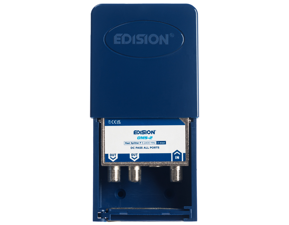 EDISION ΔΙΑΚΛΑΔΩΤΗΣ ΙΣΤΟΥ 2 ways F 5-2400Mhz OMS-2. Διαθέτει ειδικό κυτίο εγκατάστασης σε εξωτερικό χώρο, κατασκευασμένο απο συνθετικό υλικό, με πλήρως συρόμενη και αποσπώμενη πρόσθια πλευρά, καθώς και με κινητό και αποσπώμενο σημείο εισόδου και διαχείρησης καλωδίων. Στην πίσω πλευρά διαθέτει διάταξη δαγκάνας και πολλαπλές θέσεις στερέωσης με δεματικό (περιέχεται) αλλά και έτοιμες αναμονές για στερέωση με ούπα και βίδες (περιέχονται). Εντός του κυτίου υπάρχει, με διάταξη ανάκλισης, διακλαδωτής “All-band” τηλεοπτικού σηματος με φις τύπου F θηλυκά και χυτό, μονοκόμματο, επινικελωμένο κέλυφος ψευδαργύρου. Είναι σχεδιασμένο και κατασκευασμένο με υψηλά πρότυπα απόδοσης, προσφέροντας χαμηλές απώλειες διέλευσης, υψηλή απομόνωση μεταξύ των εξόδων και μπορεί να χρησιμοποιηθεί σε όλες τις τηλεοπτικές εγκαταστάσεις τόσο με Επίγειο Ψηφιακό, όσο και με Δορυφορικό σήμα (σύμφωνα με τις επιλογές του τεχνικού της εγκατάστασης). Διαθέτει 1 είσοδο και 2 εξόδους για διαμοιρασμό σήματος απο το δίκτυο ομοαξονικού καλωδίου, μαζί με διέλευση ρεύματος DC απο όλες τις εξόδους προς την είσοδο, διευκολύνοντας τον τεχνικό σε εγκαταστάσεις δορυφορικής τηλεόρασης και επίσης όταν χρειάζεται πέρασμα ρεύματος DC προς κεραίες, για παράδειγμα, με ενεργό δίπολο ή προς ενισχυτές ιστού.