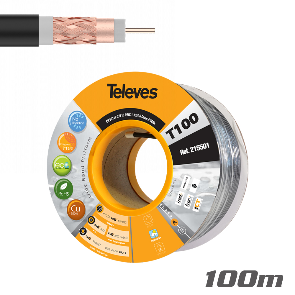 To TELEVES 215501 ΚΑΛΩΔΙΟ Coaxial T100plus Cu/Cu Fca PE Black 100m, είναι ένα ομοαξονικό καλώδιο ΡΕ χρώματος μαύρου, με εξαιρετικά τεχνικά χαρακτηριστικά και υψηλή απόδοση, 75Ω, για ΕΞΩΤΕΡΙΚΟ ΧΩΡΟ, με προδιαγραφές Fca Euroclass και A Class shielded. Είναι 100% χαλκός, τόσο στον αγωγό όσο και στο μπλεντάζ. Διαθέτει διπλή θωράκιση Χαλκό + Πολυεστέρα καθώς και ANTIMIGRATING foil. Σε στροφείο 100 μέτρων.
