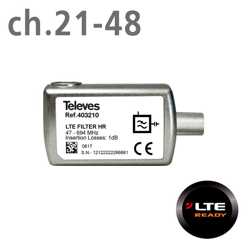Televes 403210 φίλτρο αποκοπής συχνοτήτων 5G-LTE [733-862 ΜΗΖ]. Απορριπτει τις συχνότητες απο το κανάλι UHF 48 και πάνω, προστατεύοντας το τηλεοπτικό σήμα απο τις παρεμβολές του φάσματος 5G LTE. Διαθέτει σύνδεση βύσματος εξόδου σήματος τύπου TV, για ευκολία χρήσης αλλά και για απευθείας σύνδεση του στην είσοδο κεραίας πίσω απο την TV.