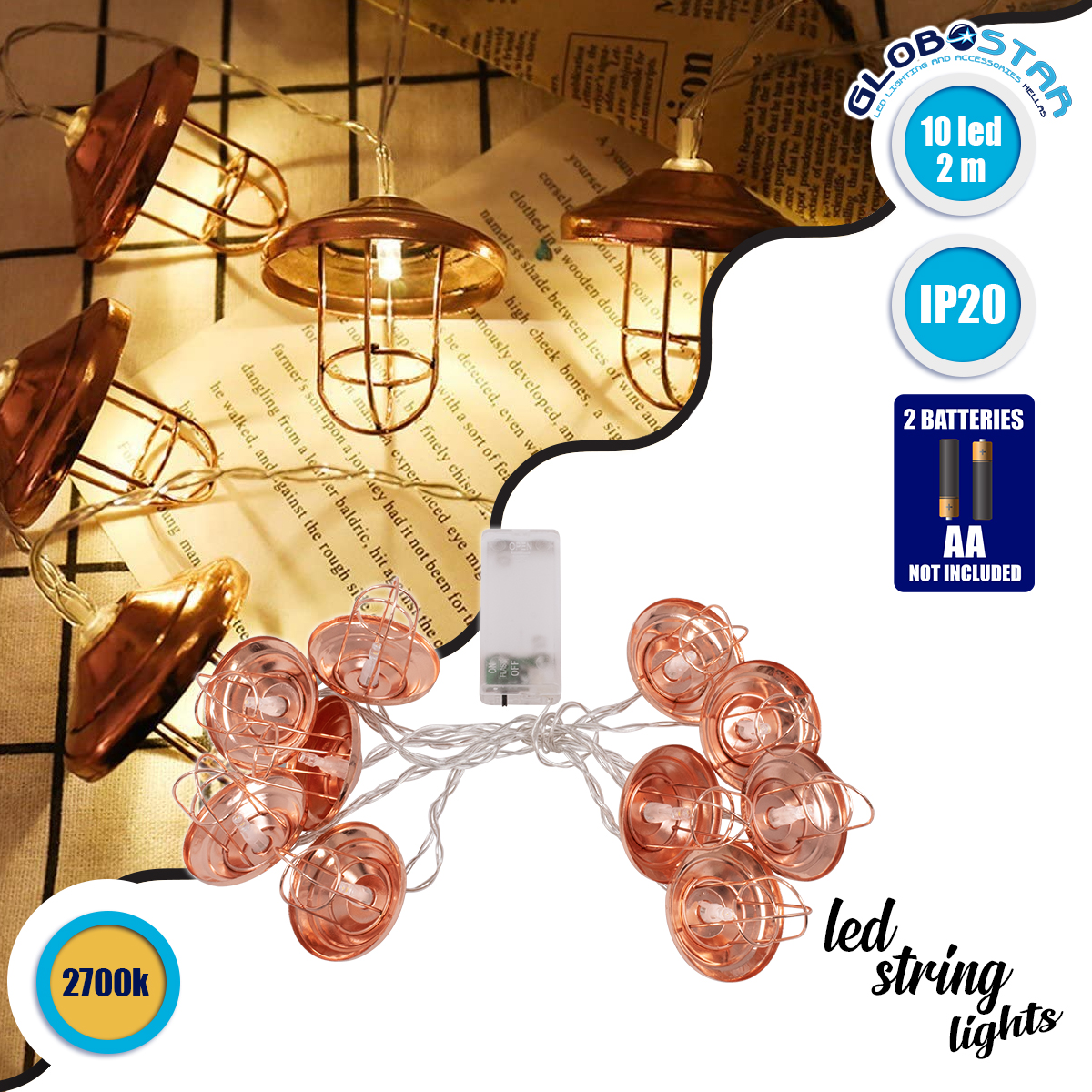 79807 Διακοσμητική Γιρλάντα Bronze Lamp 2 Μέτρα με Διακόπτη On/Off – 10 LED 1W με Μπαταρίες 2xAA & Διάφανο Καλώδιο IP20 Θερμό Λευκό 2700K Μ2m
