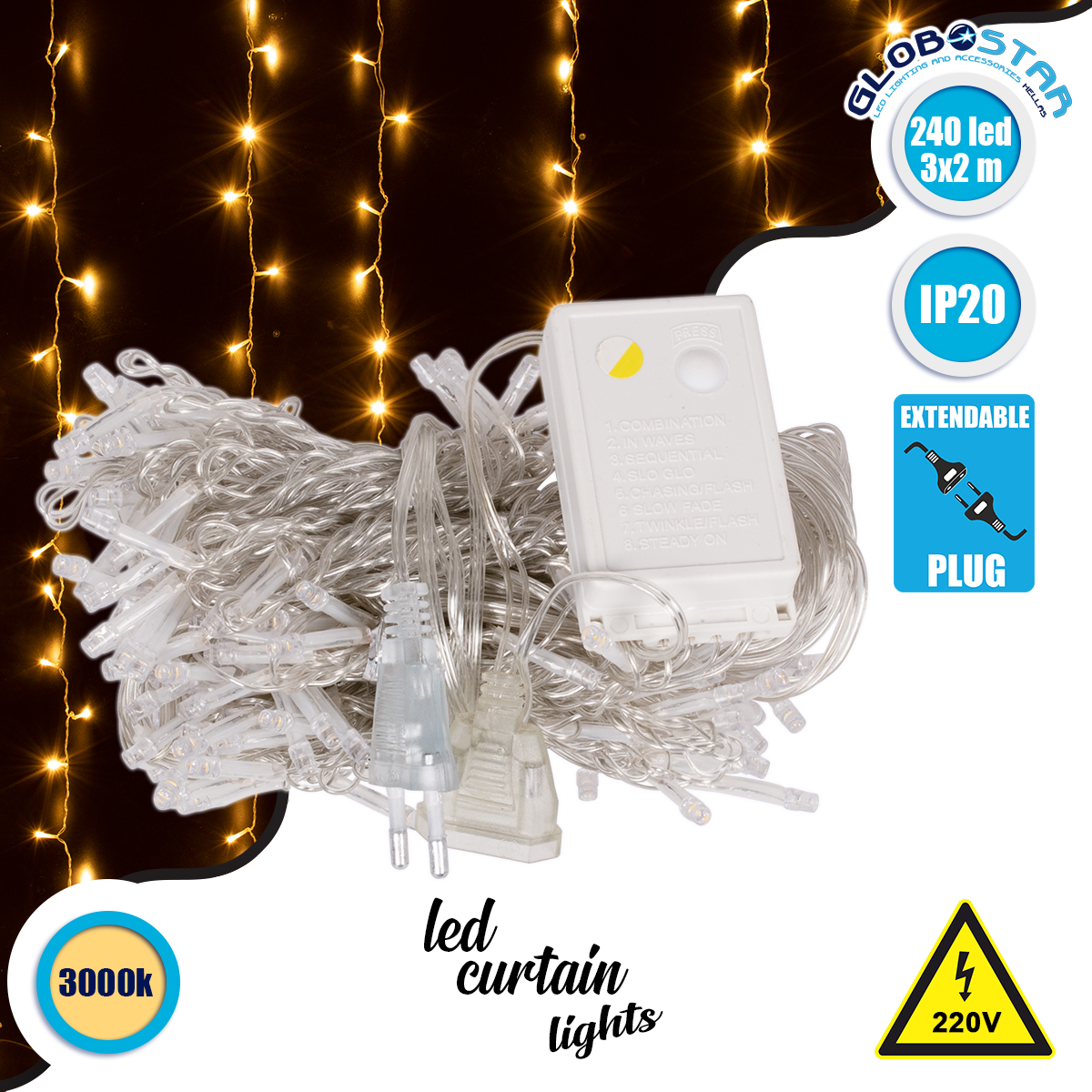 85800 Διακοσμητική Κουρτίνα 3 x 2 Μέτρα με Controller 8 Προγραμμάτων Φωτισμού – Επεκτεινόμενη 240 LED 6W AC 230V με Διάφανο Καλώδιο & Πρίζα Schuko IP20 Θερμό Λευκό 3000K Μ3 x Υ2m