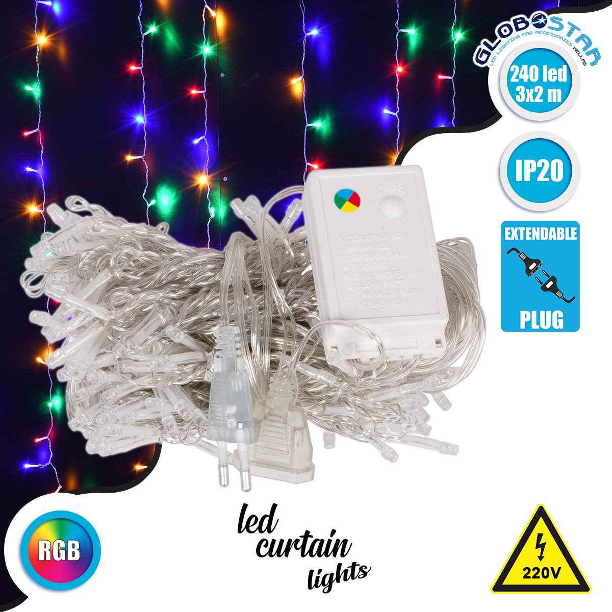 85802 Διακοσμητική Κουρτίνα 3 x 2 Μέτρα με Controller 8 Προγραμμάτων Φωτισμού – Επεκτεινόμενη 240 LED 6W AC 230V με Διάφανο Καλώδιο & EU Πρίζα IP20 Πολύχρωμο RGB Μ3 x Υ2m