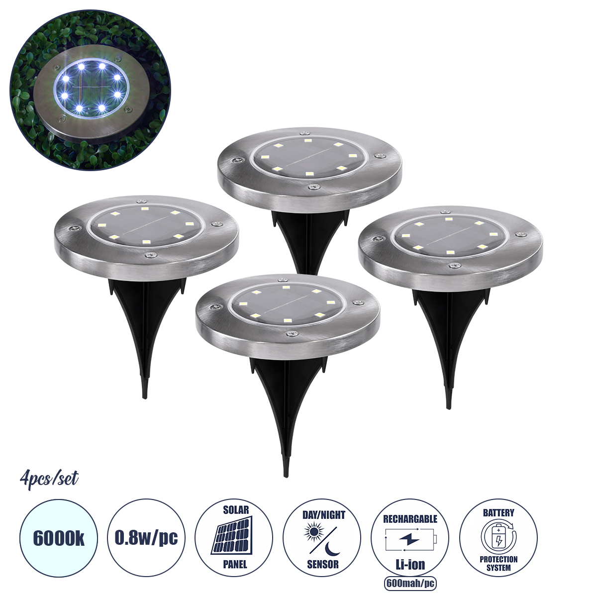 GloboStar® 69929 ΣΕΤ 4 Τεμαχίων Αυτόνομα Ηλιακά Φωτιστικά LED SMD 0.80W/Τεμ. 80lm/Τεμ. με Ενσωματωμένη Μπαταρία 600mAh – Φωτοβολταϊκό Πάνελ με Αισθητήρα Ημέρας-Νύχτας Αδιάβροχο IP65 Φανάρι Κήπου Στρογγυλό Ψυχρό Λευκό 6000K Φ12 x Υ13cm