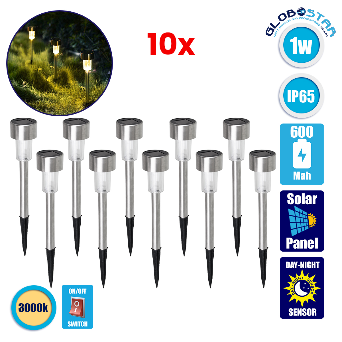 GloboStar® 71521-10 ΣΕΤ 10 Τεμαχίων Αυτόνομα Ηλιακά Φωτιστικά LED SMD 1W 40lm με Ενσωματωμένη Μπαταρία 600mAh – Φωτοβολταϊκό Πάνελ με Αισθητήρα Ημέρας-Νύχτας Αδιάβροχο IP65 Φανάρι Κήπου Στρογγυλό Θερμό Λευκό 2700K