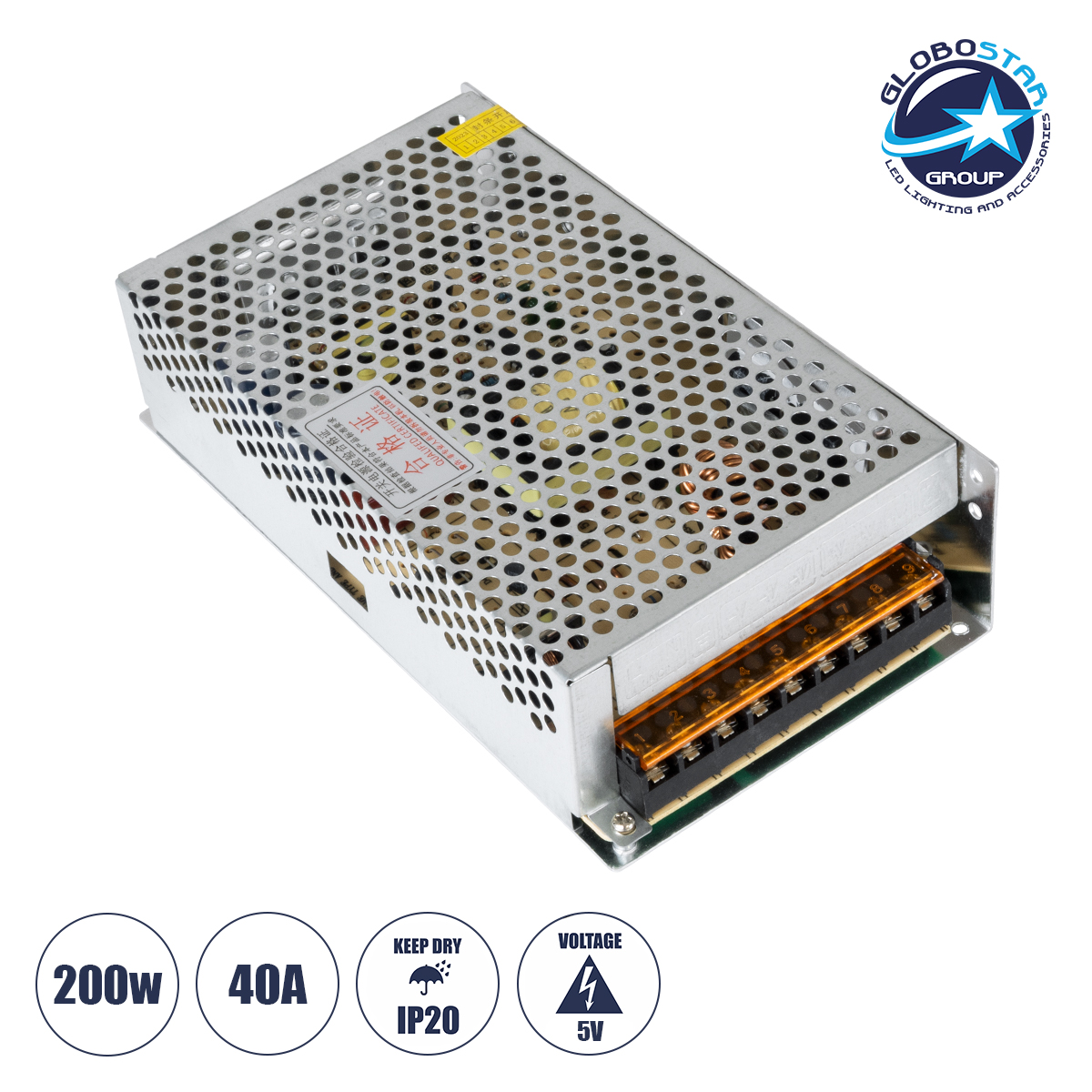GloboStar® 73021 Μεταλλικό Τροφοδοτικό PELV για Προϊόντα LED 200W 40A – AC 220-240V σε DC 5V – IP20 – Μ20 x Π11 x Υ5cm – 3 Χρόνια Εγγύηση