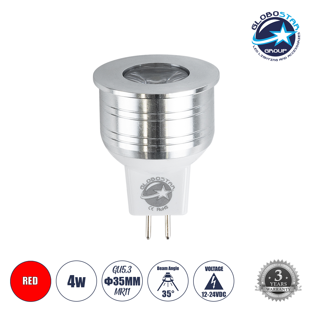 GloboStar® 76003 Σποτ LED GU5.3 MR11 4W 240lm 35° DC 12-24V IP20 Φ3.5 x Υ5cm Κόκκινο – 1 Χρόνο Εγγύηση
