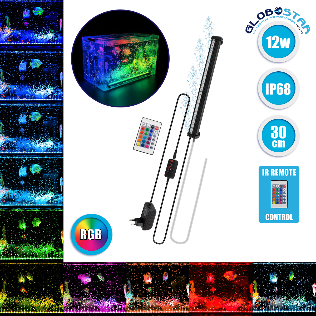 GloboStar® 79675 Φωτιστικό Ενυδρείου & Οξυγονωτής / Μηχανισμός Φυσαλίδων 30cm LED 12W 180° AC 230V Αδιάβροχο IP68 με Ασύρματο Χειριστήριο IR Πολύχρωμο RGB Dimmable