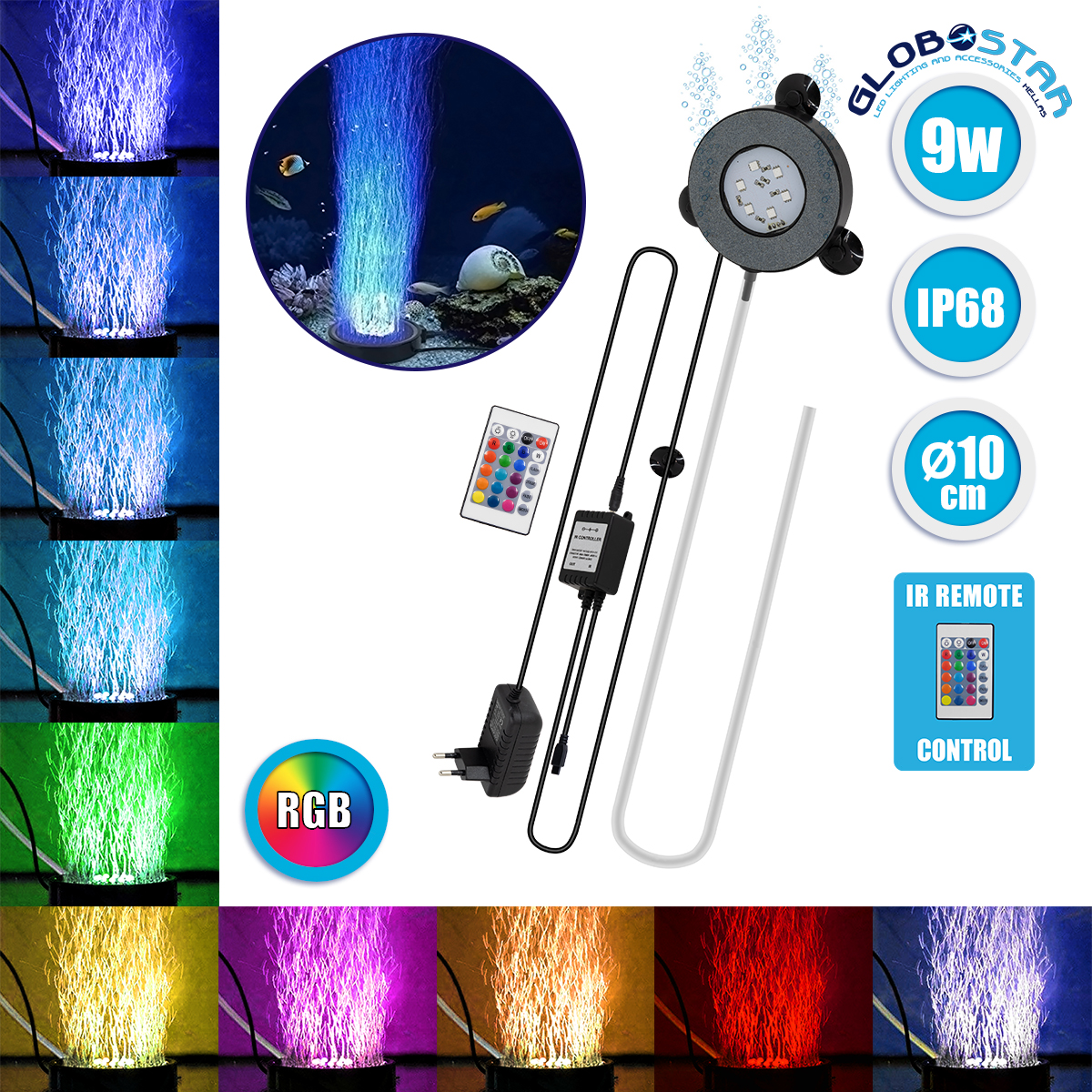 GloboStar® 79683 Φωτιστικό Ενυδρείου & Οξυγονωτής / Μηχανισμός Φυσαλίδων Φ10cm LED 9W 180° AC 230V Αδιάβροχο IP68 με Ασύρματο Χειριστήριο IR Πολύχρωμο RGB