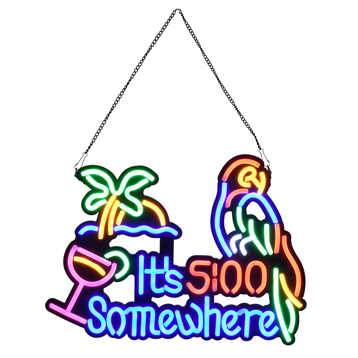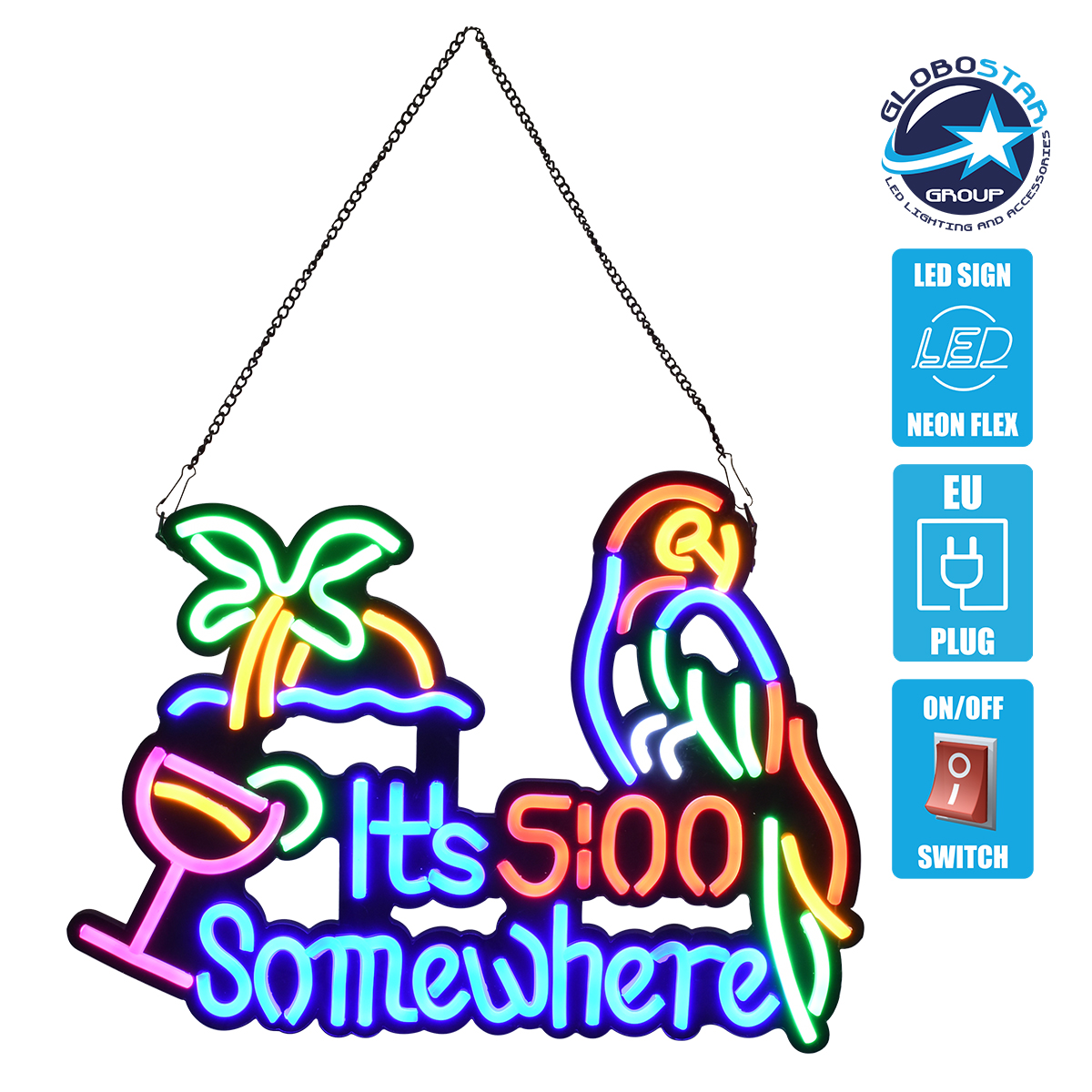 GloboStar® 85854 Φωτιστικό Ταμπέλα Φωτεινή Επιγραφή NEON LED Σήμανσης ITS 5:00 SOMEWHERE PARROT 30W AC 230V με Διακόπτη On/Off Ροζ – Γαλάζιο – Κίτρινο – Πράσινο – Κόκκινο