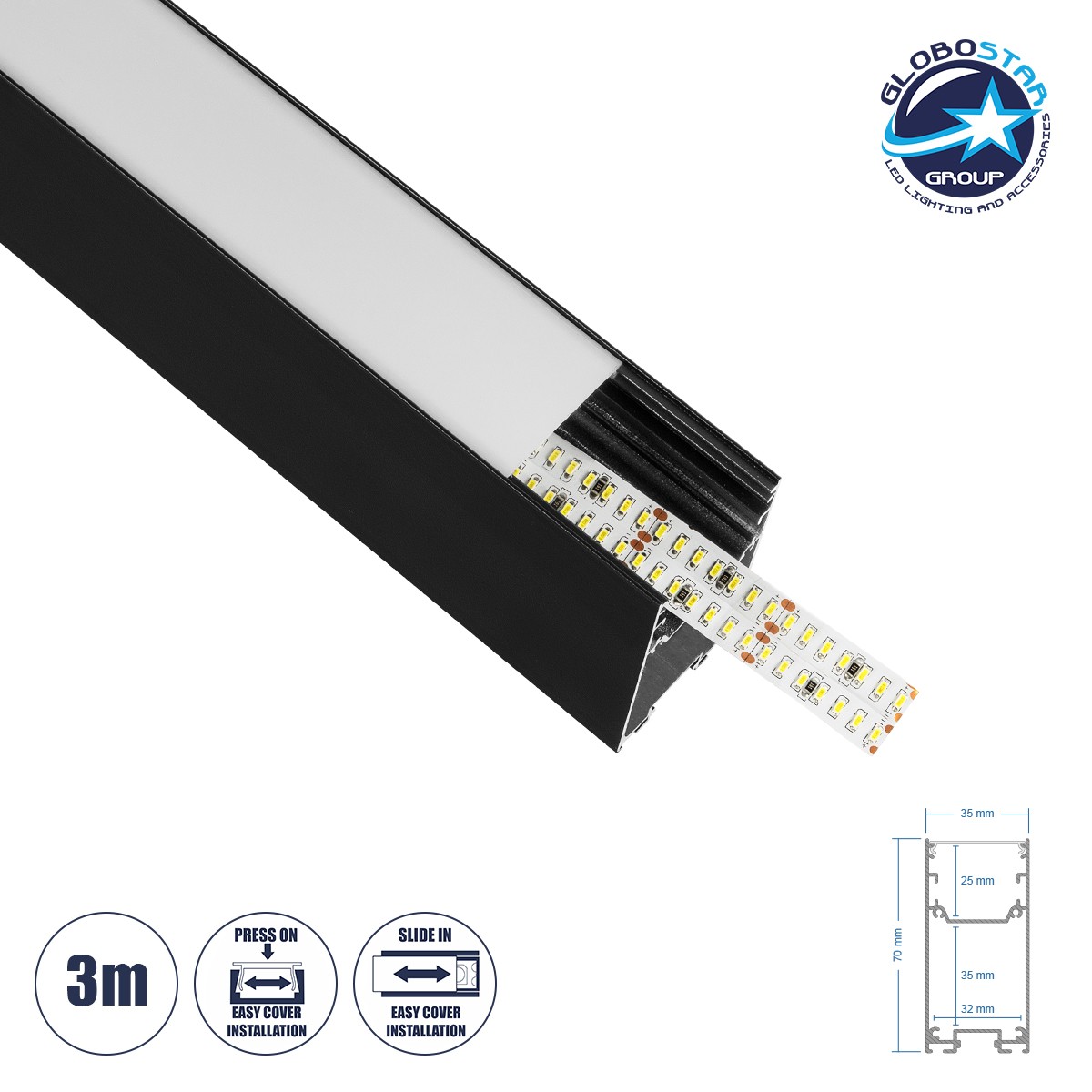 GLOBOSTAR® ALP-LINEAR LUMILINE 61764-3M Επιφανειακό / Κρεμαστό / Επιτοίχιο Προφίλ Αλουμινίου με Λευκό Γαλακτερό Πατητό Κάλυμμα για Ταινίες LED IP20 – Μαύρο Ματ – Μ300 x Π3.5 x Υ7cm