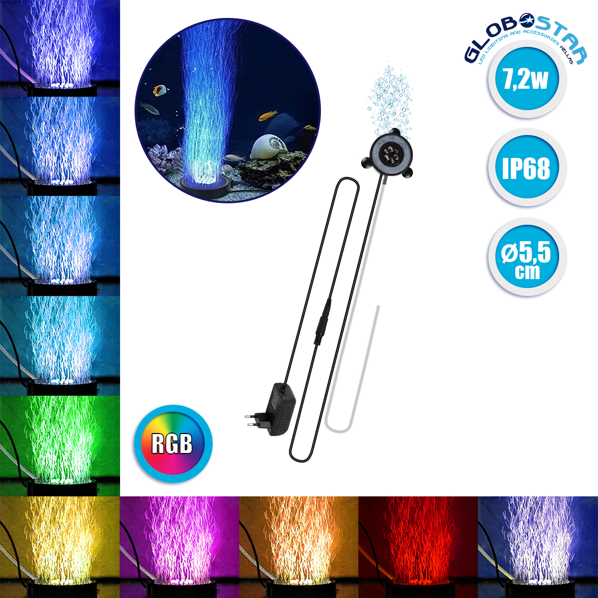 GLOBOSTAR® AQUARIUS 79682 Φωτιστικό Ενυδρείου με Οξυγονωτή LED 7.2W 360lm 180° AC 220-240V Αδιάβροχο IP68 Πολύχρωμο RGB – Sanan SMD Chip – Μαύρο – Μ5.5 x Π5.5 x Υ2.1cm – 2 Χρόνια Εγγύηση