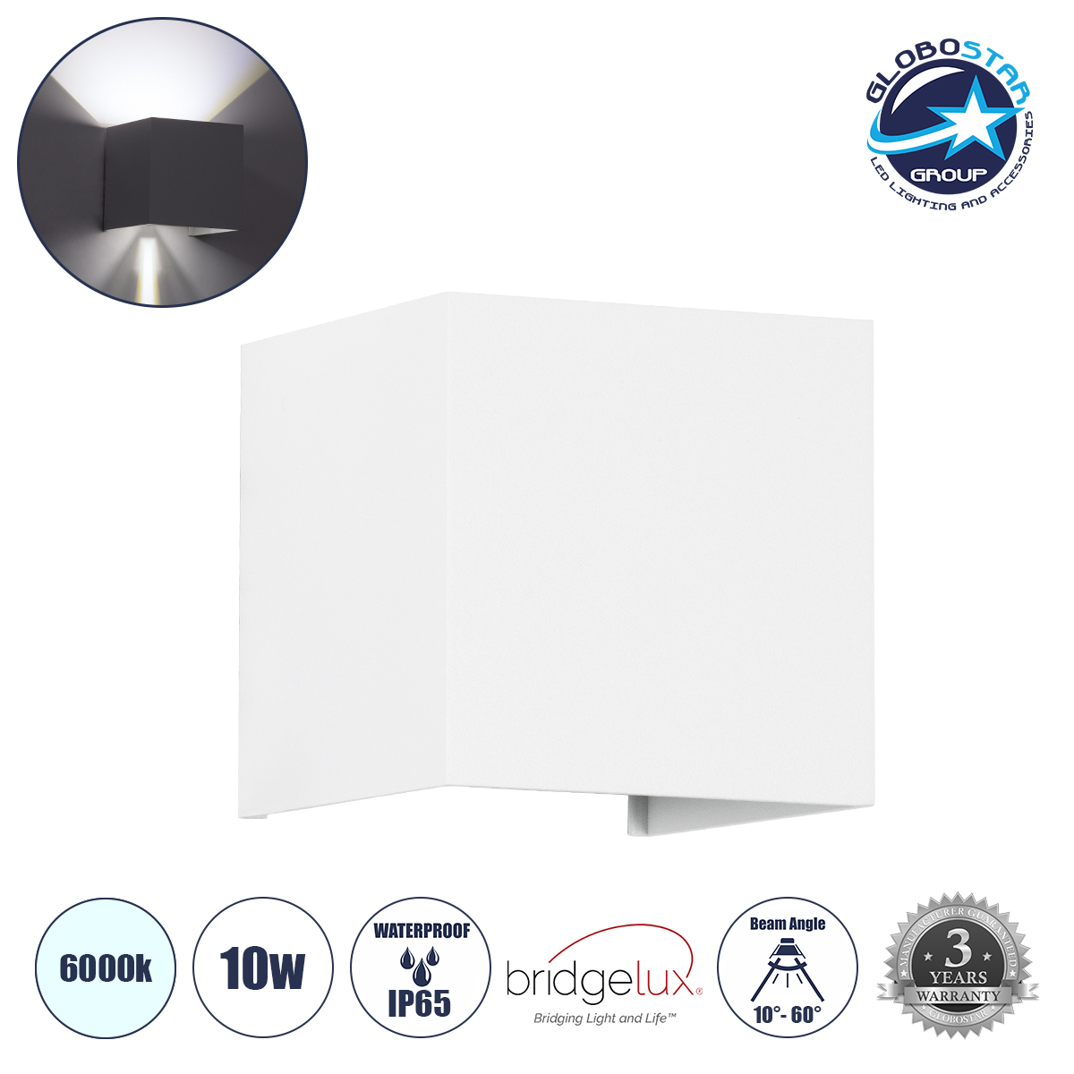 GLOBOSTAR® AXIS-S 60566 Μοντέρνο Φωτιστικό Τοίχου – Απλίκα LED 10W 1250lm 5°/60° AC 220-240V Αδιάβροχο IP65 Ψυχρό Λευκό 6000K – Bridgelux COB Chip & TÜV SÜD Driver – Λευκό Ματ – Μ10 x Π10 x Υ10cm – 5 Χρόνια Εγγύηση