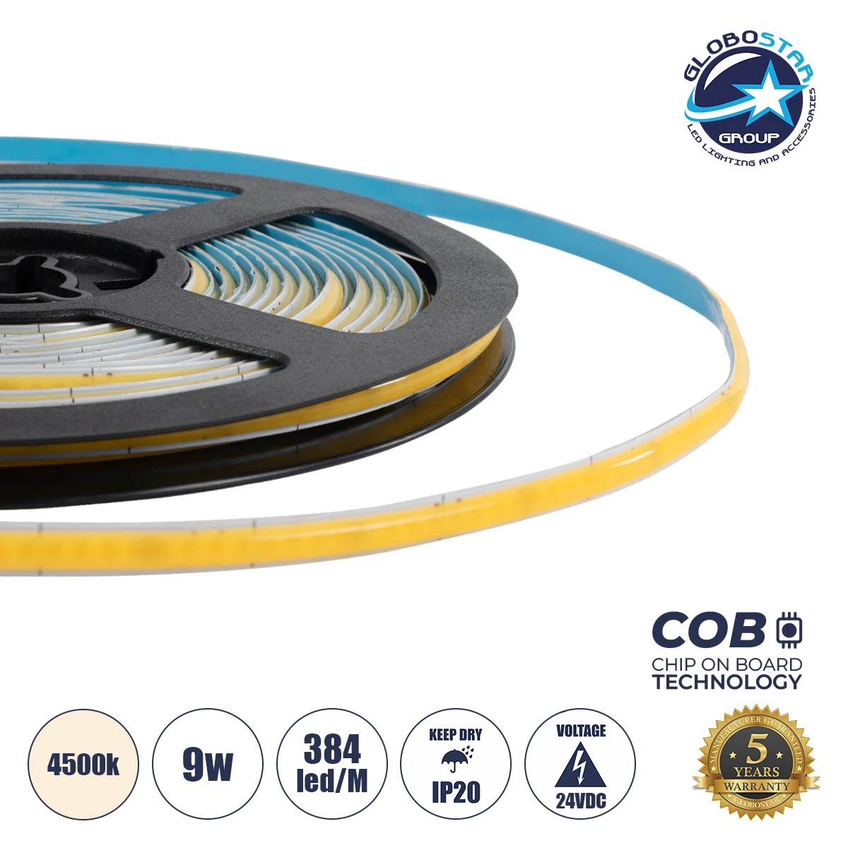 GLOBOSTAR® BEE 70356 Ταινία LED 9W/m 900lm/m 120° DC 24V IP20 384 x COB Chip/m Φυσικό Λευκό 4500K Dimmable – Sanan COB Chip – Μ500 x Π0.5 x Υ0.2cm – Ρολό 5 Μέτρων – 5 Χρόνια Εγγύηση