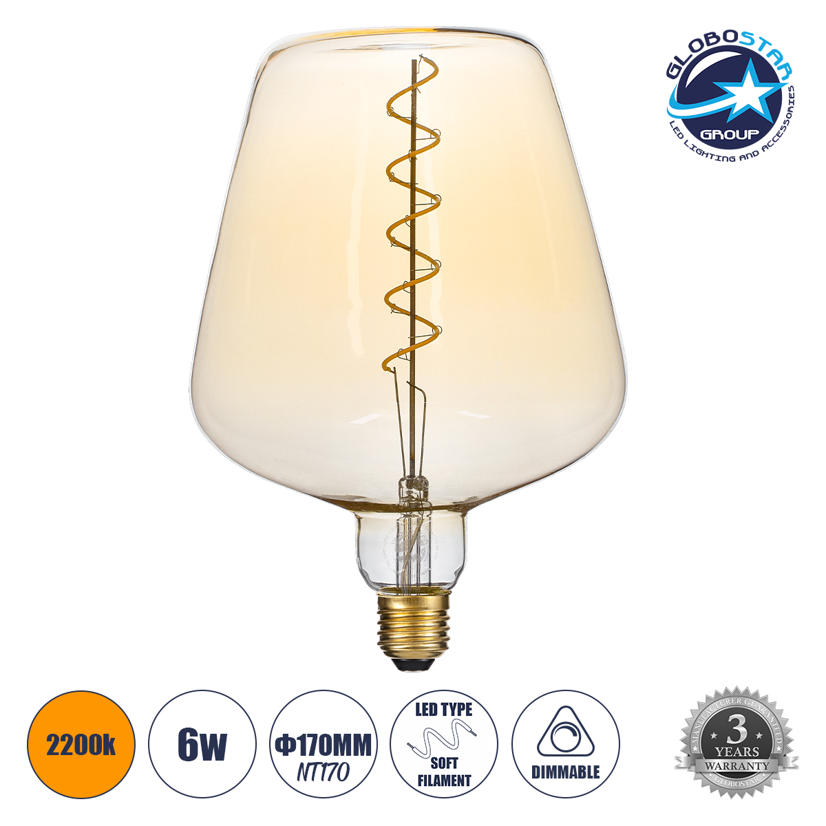 GLOBOSTAR® BRANDY 99025 Λάμπα E27 NT170 LED 6W 420lm 360° AC 220-240V IP20 Ultra Θερμό Λευκό 2200K Dimmable – Soft S Spiral Filament Chip – Μελί – Μ17 x Π17 x Υ23cm – 3 Χρόνια Εγγύηση