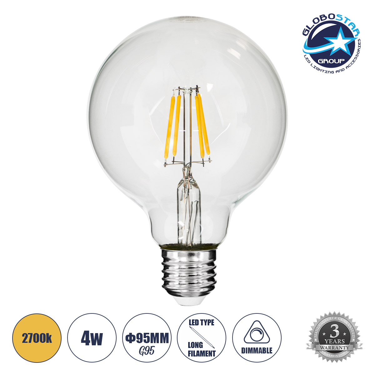 GLOBOSTAR® BUBBLE 99009 Λάμπα E27 G95 LED 4W 400lm 360° AC 220-240V IP20 Θερμό Λευκό 2700K – Long Filament Chip – Διάφανο – Μ9.5 x Π9.5 x Υ13.7cm – 3 Χρόνια Εγγύηση