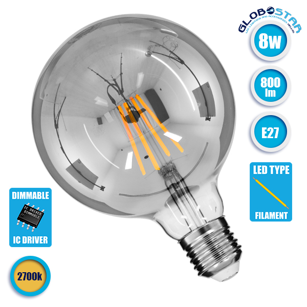 GLOBOSTAR® BUBBLE 99073 Λάμπα E27 G125 LED 8W 800lm 360° AC 220-240V IP20 Θερμό Λευκό 2700K Dimmable – Long Filament Chip – Μαύρο Φιμέ – Μ12.5 x Π12.5 x Υ17.8cm – 3 Χρόνια Εγγύηση