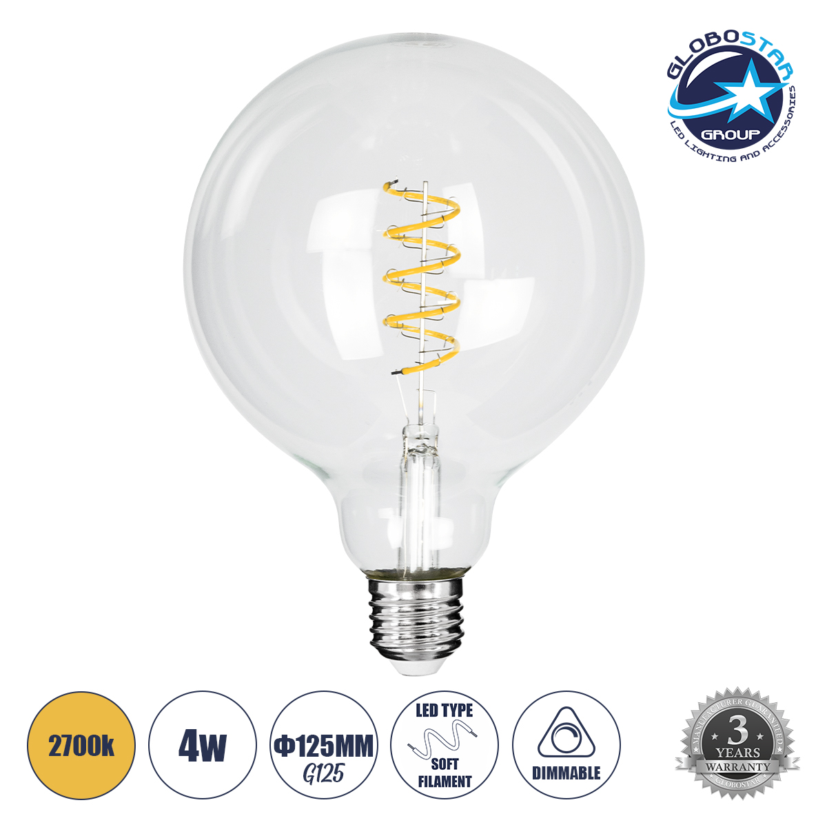 GLOBOSTAR® BUBBLE 99137 Λάμπα E27 G125 LED 4W 300lm 360° AC 220-240V IP20 Θερμό Λευκό 2700K Dimmable – Soft S Spiral Filament Chip – Διάφανο – Μ12.5 x Π12.5 x Υ18cm – 3 Χρόνια Εγγύηση