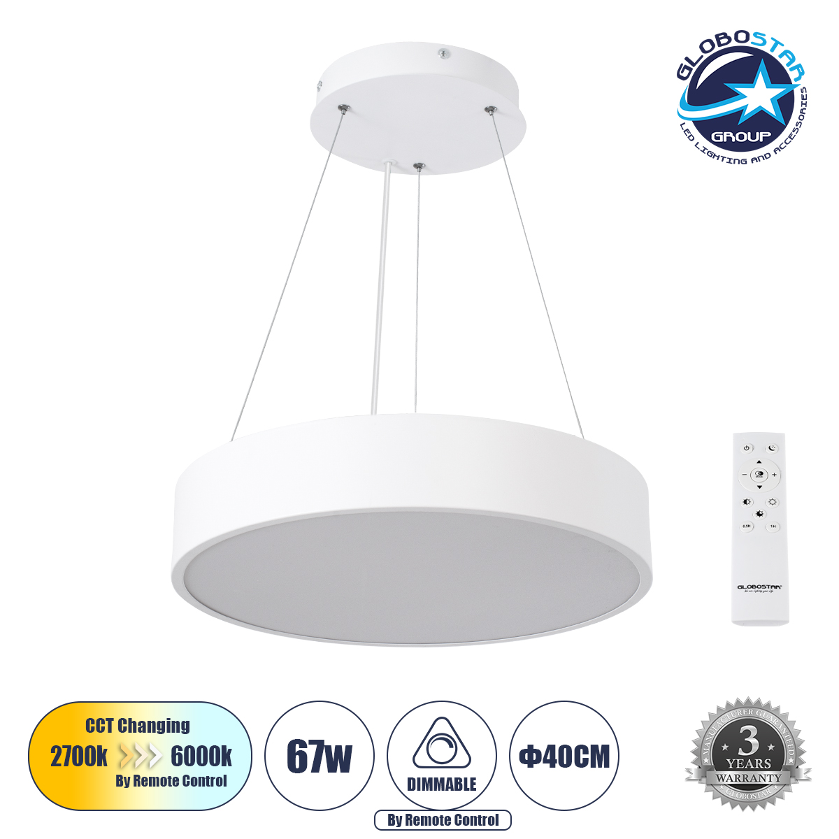 GLOBOSTAR® BURTON 61201 Μοντέρνο Κρεμαστό Φωτιστικό Οροφής LED 67W 7370lm 120° AC 220-240V IP20 Ρυθμιζόμενο Λευκό CCT με Χειριστήριο από 2700K έως 6000K Dimmable – Lumileds SMD Chip – Λευκό Ματ – Μ40 x Π40 x Υ8cm – 3 Χρόνια Εγγύηση