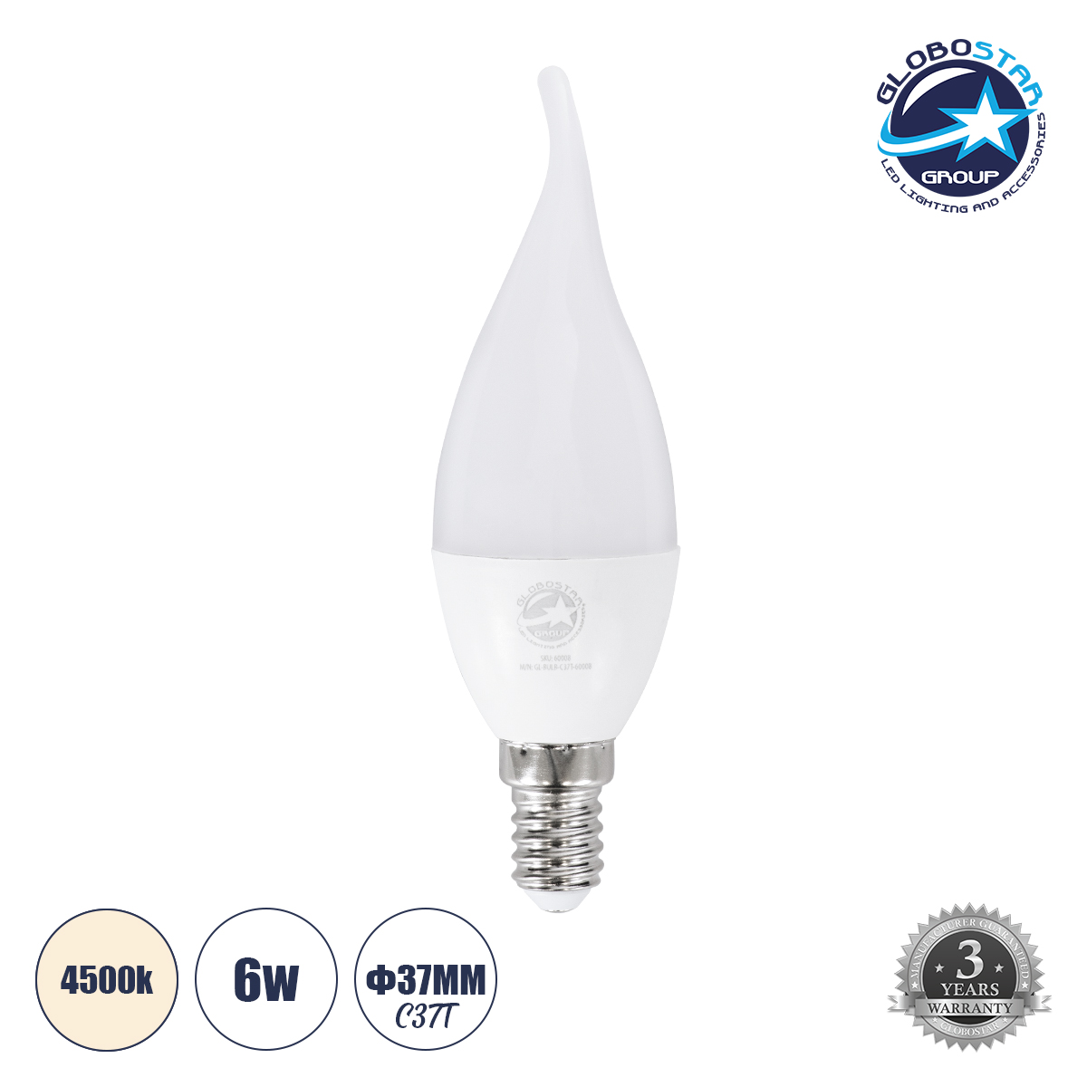 GLOBOSTAR® CANDLE 60007 Λάμπα Κεράκι E14 C37T LED 6W 582lm 260° AC 220-240V IP20 Φυσικό Λευκό 4500K – Lumileds SMD Chip – Λευκό Γαλακτερό – Μ3.7 x Π3.7 x Υ10cm – 3 Χρόνια Εγγύηση