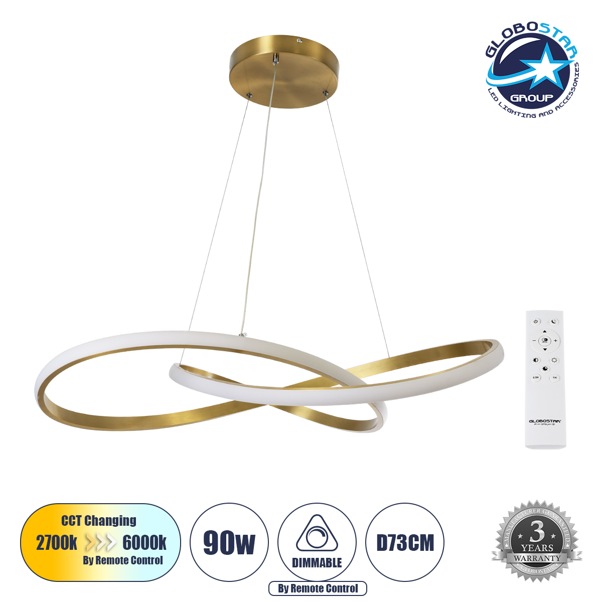 GLOBOSTAR® DEXTER 60916 Μοντέρνο Κρεμαστό Φωτιστικό Οροφής LED 90W 10080lm 300° AC 220-240V IP20 Ρυθμιζόμενο Λευκό CCT με Χειριστήριο από 2700K έως 6000K Dimmable – Lumileds SMD Chip – Σατινέ Χρυσό Βούρτσας – Μ73 x Π73 x Υ16cm – 3 Χρόνια Εγγύηση