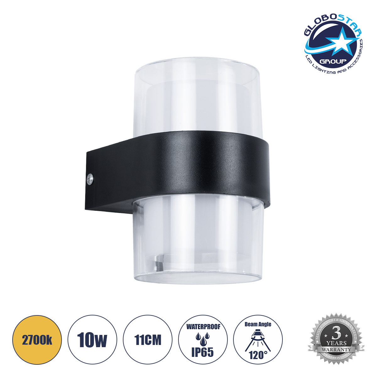 GLOBOSTAR® EMPIRE 60777 Μοντέρνο Φωτιστικό Τοίχου – Απλίκα LED 10W 1050lm 120° AC 220-240V Αδιάβροχο IP65 Θερμό Λευκό 2700K – Bridgelux SMD Chip & TÜV SÜD Driver – Διάφανο & Μαύρο Ματ – M10 x Π11 x Υ13.5cm – 3 Χρόνια Εγγύηση
