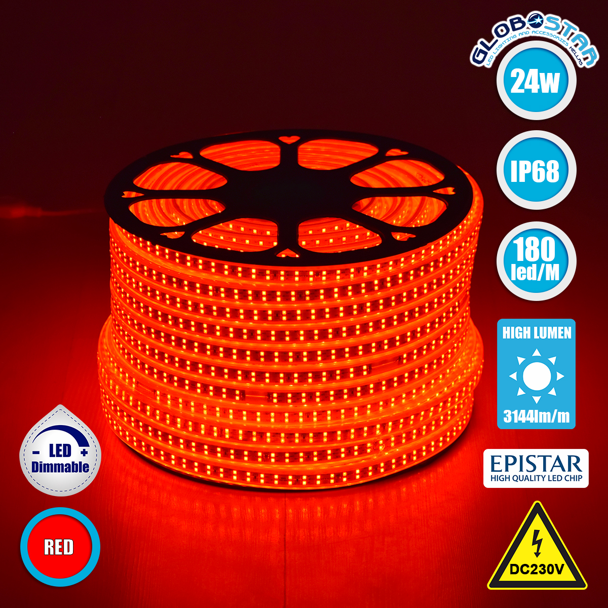 GLOBOSTAR® EPIWIDE 70514 Ταινία LED 24W/m 1560lm/m 120° DC 220-240V Αδιάβροχη IP65 180 x SMD2835 Chip/m Κόκκινο Dimmable – Epistar SMD Chip – M100 x Π1.6 x Υ0.7cm – 3 Χρόνια Εγγύηση