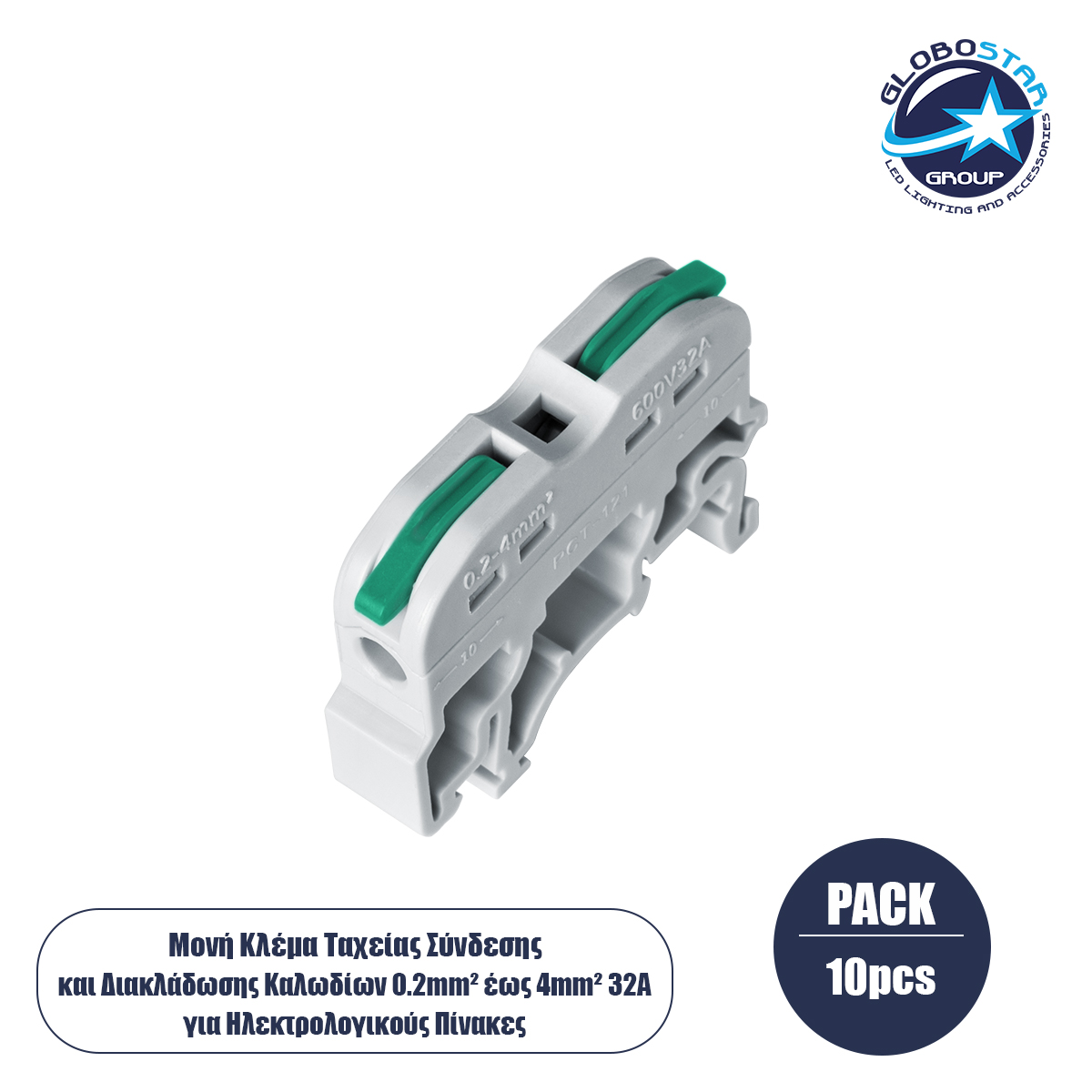 GloboStar® FAST-CONNECT 69902 Μονή Κλέμα Ράγας Ταχείας Σύνδεσης & Διακλάδωσης Καλωδίων για Ηλεκτρολογικούς Πίνακες – 1 x Είσοδος & 1 x Έξοδος με Συμβατή Διατομή Καλωδίων 0.2mm² έως 4mm² – 600V 32A Max – Μ4.5 x Π1 x Υ3.2cm – Γκρι & Πράσινο – Πακέτο 10 Τεμαχίων – 5 Years Warranty