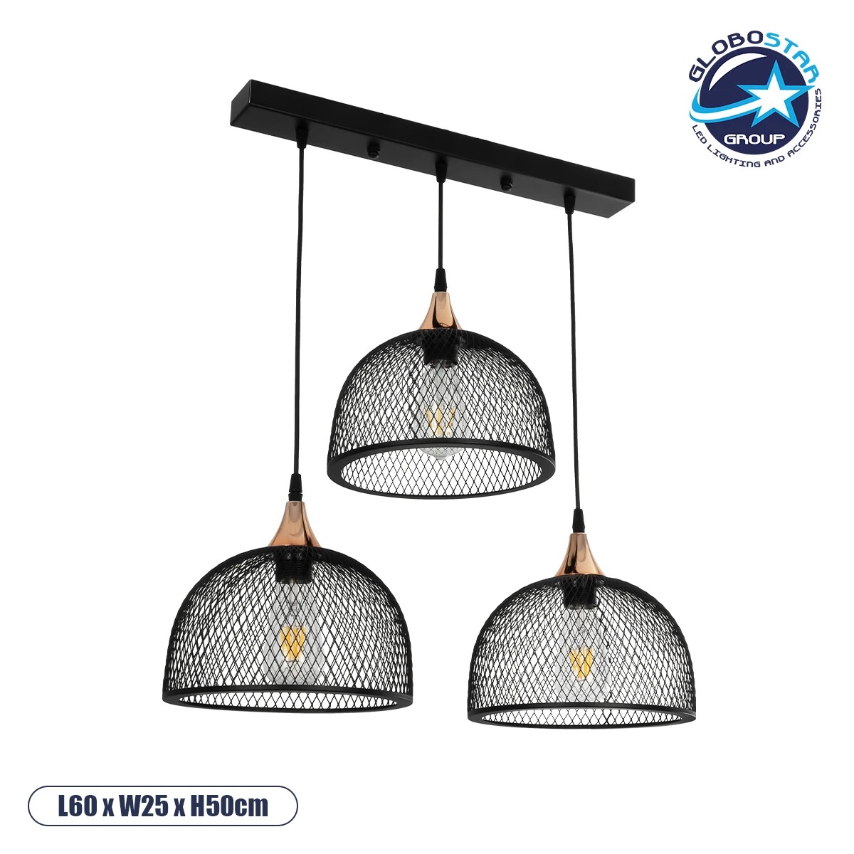 GLOBOSTAR® GLIND 201-0082 Vintage Κρεμαστό Φωτιστικό Οροφής με Ντουί 3 x E27 AC 220-240V IP20 – Μαύρο – Μ60 x Π25 x Υ50cm