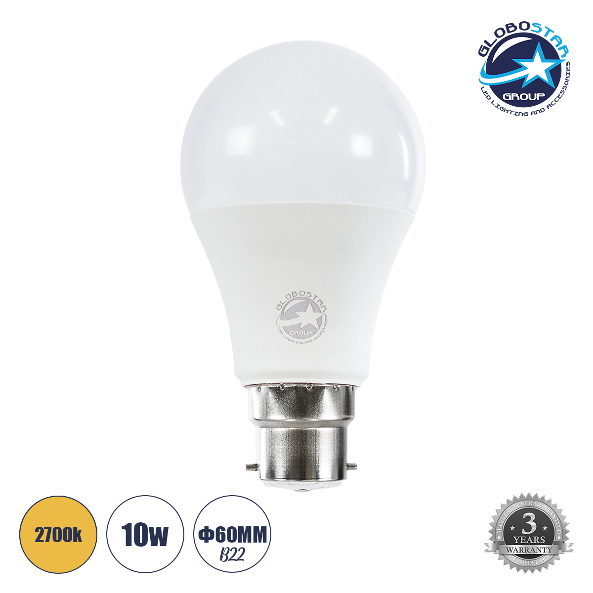 GLOBOSTAR® GLOBE 60053 Λάμπα B22 A60 LED 10W 940lm 360° AC 220-240V IP20 Θερμό Λευκό 2700K – Lumileds SMD Chip – Λευκό Γαλακτερό – Μ6 x Π6 x Υ11cm – 3 Χρόνια Εγγύηση