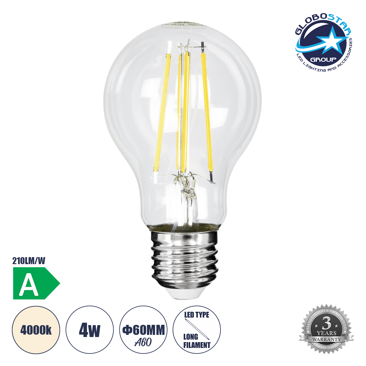 GLOBOSTAR® GLOBE 99091 Λάμπα E27 A60 LED 4W 840lm 360° AC 220-240V IP20 Φυσικό Λευκό 4500K – Long Filament Chip – Διάφανο – Μ6 x Π6 x Υ11cm – 3 Χρόνια Εγγύηση