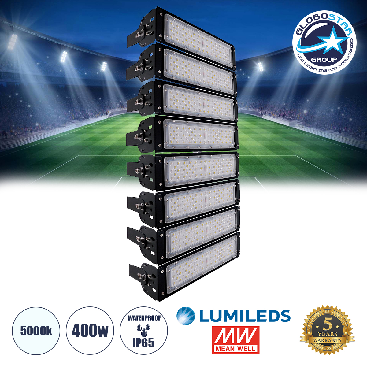 GLOBOSTAR® GOLIATH 90100-8 Προβολέας για Γήπεδα Tennis & Ποδοσφαίρου 5×5 LED 400W 60000lm 75°x135° SDCM<5 Fish Eye Lens AC 220-240V Αδιάβροχο IP65 IK08 Φυσικό Λευκό 5000K - Lumileds SMD Chip & Mean Well Driver - Μαύρο Ματ - Μ32 x Π12 x Υ72cm - 5 Χρόνια Εγγύηση