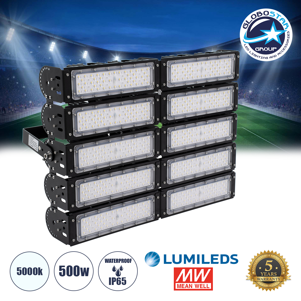 GLOBOSTAR® GOLIATH 90104 Προβολέας για Γήπεδα Tennis & Ποδοσφαίρου 5×5 LED 500W 75000lm 75°x135° SDCM<5 Fish Eye Lens AC 220-240V Αδιάβροχο IP65 IK08 Φυσικό Λευκό 5000K - Lumileds SMD Chip & Mean Well Driver - Μαύρο Ματ - Μ62 x Π22 x Υ45cm - 5 Χρόνια Εγγύηση