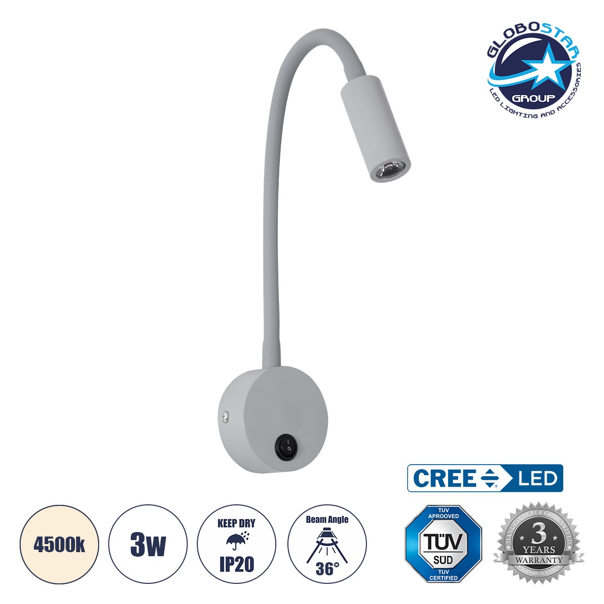 GLOBOSTAR® GOOSE 60877 Μοντέρνο Φωτιστικό Τοίχου – Απλίκα Ξενοδοχείου Reading Light LED 3W 300lm 36° AC 220-240V IP20 Φυσικό Λευκό 4500K – CREE XPE Chip & TÜV SÜD Driver – Γκρι Ανθρακί Ματ – Μ6.5 x Π15 x Υ24.5cm – 3 Χρόνια Εγγύηση