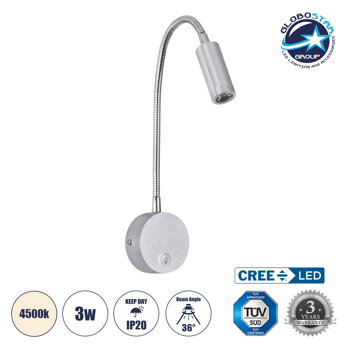 GLOBOSTAR® GOOSE 60879 Μοντέρνο Φωτιστικό Τοίχου – Απλίκα Ξενοδοχείου Reading Light LED 3W 300lm 36° AC 220-240V IP20 Φυσικό Λευκό 4500K – CREE XPE Chip & TÜV SÜD Driver – Νίκελ Βούρτσας – Μ6.5 x Π15 x Υ24.5cm – 3 Χρόνια Εγγύηση