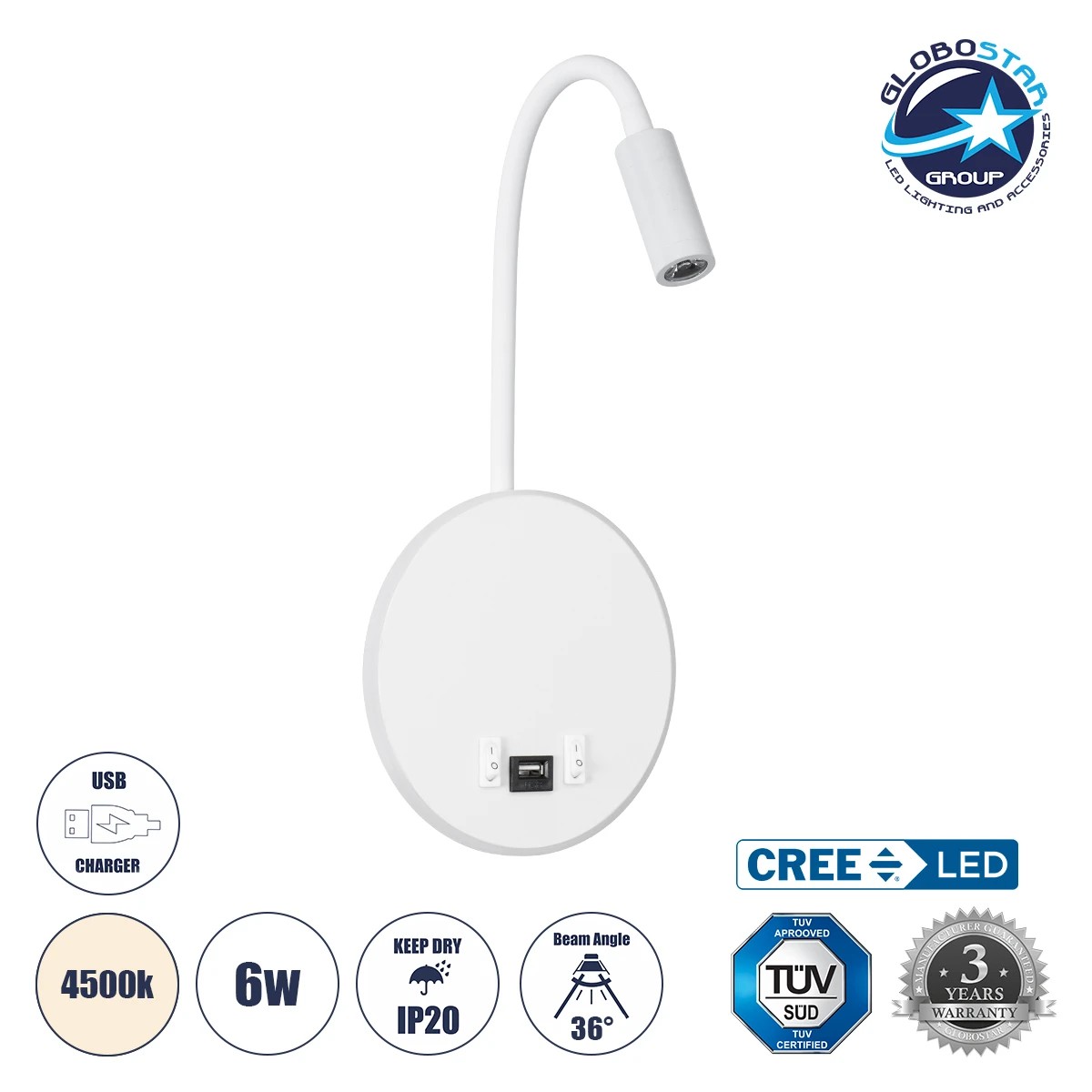 GLOBOSTAR® GOOSE 60881 Μοντέρνο Φωτιστικό Τοίχου – Απλίκα Ξενοδοχείου Reading Light με Φορτιστή USB 3A LED 6W 600lm 36° & 360° AC 220-240V IP20 Φυσικό Λευκό 4500K – CREE XPE & Lumileds SMD Chip & TÜV SÜD Driver – Λευκό Ματ – Μ15.5 x Π15 x Υ30.5cm – 3 Χρόνια Εγγύηση