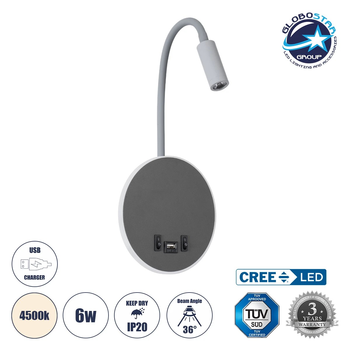 GLOBOSTAR® GOOSE 60882 Μοντέρνο Φωτιστικό Τοίχου – Απλίκα Ξενοδοχείου Reading Light με Φορτιστή USB 3A LED 6W 600lm 36° & 360° AC 220-240V IP20 Φυσικό Λευκό 4500K – CREE XPE & Lumileds SMD Chip & TÜV SÜD Driver – Γκρι Ανθρακί Ματ – Μ15.5 x Π15 x Υ30.5cm – 3 Χρόνια Εγγύηση