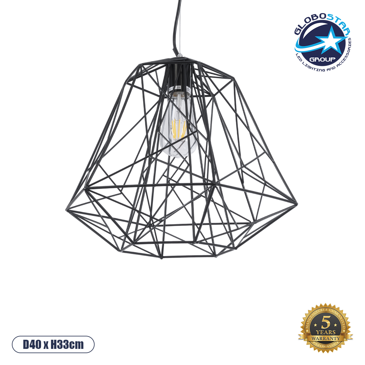 GLOBOSTAR® GRID 01022 Vintage Κρεμαστό Φωτιστικό Οροφής με Ντουί 1 x E27 AC 220-240V IP20 – Μαύρο – Μ40 x Π40 x Υ33cm