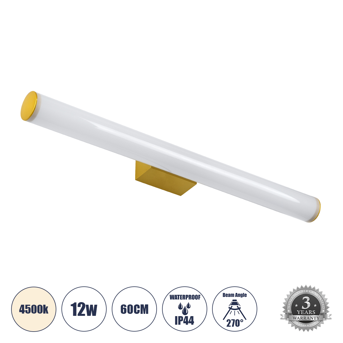 GLOBOSTAR® MABEL 60429 Μοντέρνο Φωτιστικό Τοίχου – Απλίκα Καθρέπτη Μπάνιου LED 12W 1400lm 270° AC 220-240V IP44 Φυσικό Λευκό 4500K – Lumileds SMD Chip & TÜV SÜD Driver – Σατινέ Χρυσό Βούρτσας – Μ60 x Π10 x Υ5cm – 3 Χρόνια Εγγύηση