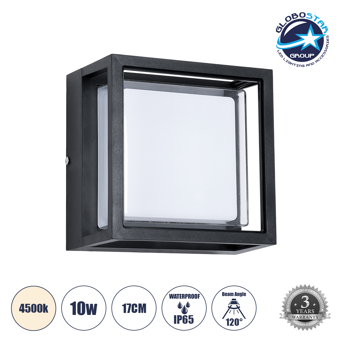 GLOBOSTAR® MAJESTIC 60773 Μοντέρνο Φωτιστικό Τοίχου – Απλίκα LED 10W 1050lm 120° AC 220-240V Αδιάβροχο IP65 Φυσικό Λευκό 4500K – Bridgelux SMD Chip – Μαύρο Ματ – Μ17 x Π17 x Υ9cm – 3 Χρόνια Εγγύηση