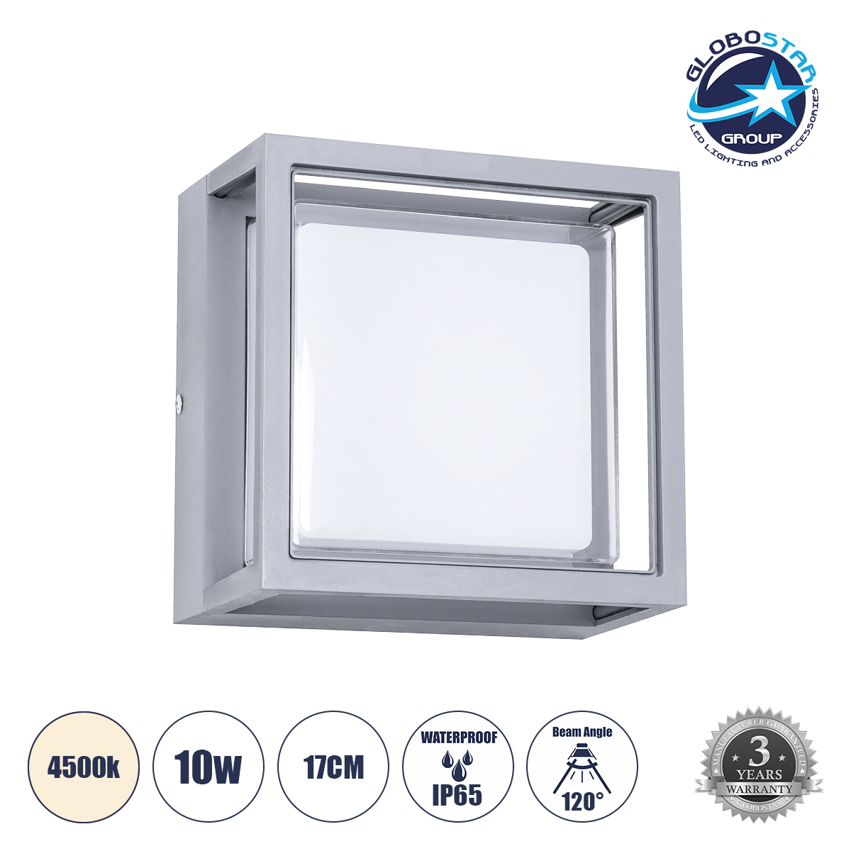 GLOBOSTAR® MAJESTIC 60774 Μοντέρνο Φωτιστικό Τοίχου – Απλίκα LED 10W 1050lm 120° AC 220-240V Αδιάβροχο IP65 Φυσικό Λευκό 4500K – Bridgelux SMD Chip – Γκρι – Μ17 x Π17 x Υ9cm – 3 Χρόνια Εγγύηση