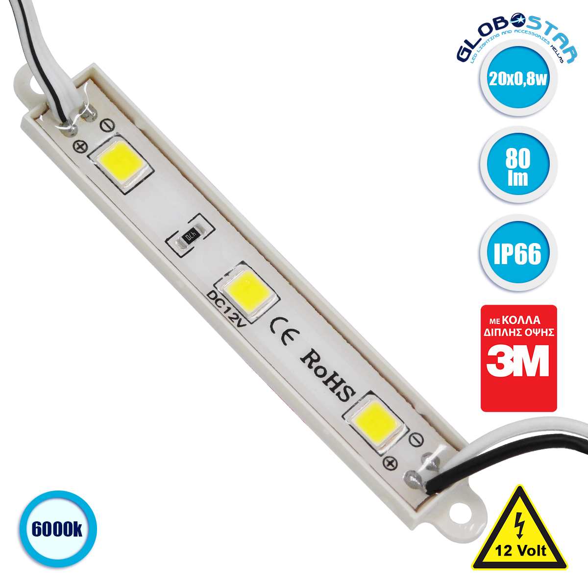 GLOBOSTAR® MODULARI 73701 Module LED 0.8W 80lm 120° DC 12V Αδιάβροχο IP66 3 x SMD5050 Chip Ψυχρό Λευκό 6000K Dimmable – Μ8.7 x Π1.3 x Υ0.5cm – Πακέτο 20 Τεμαχίων – 3 Χρόνια Εγγύηση