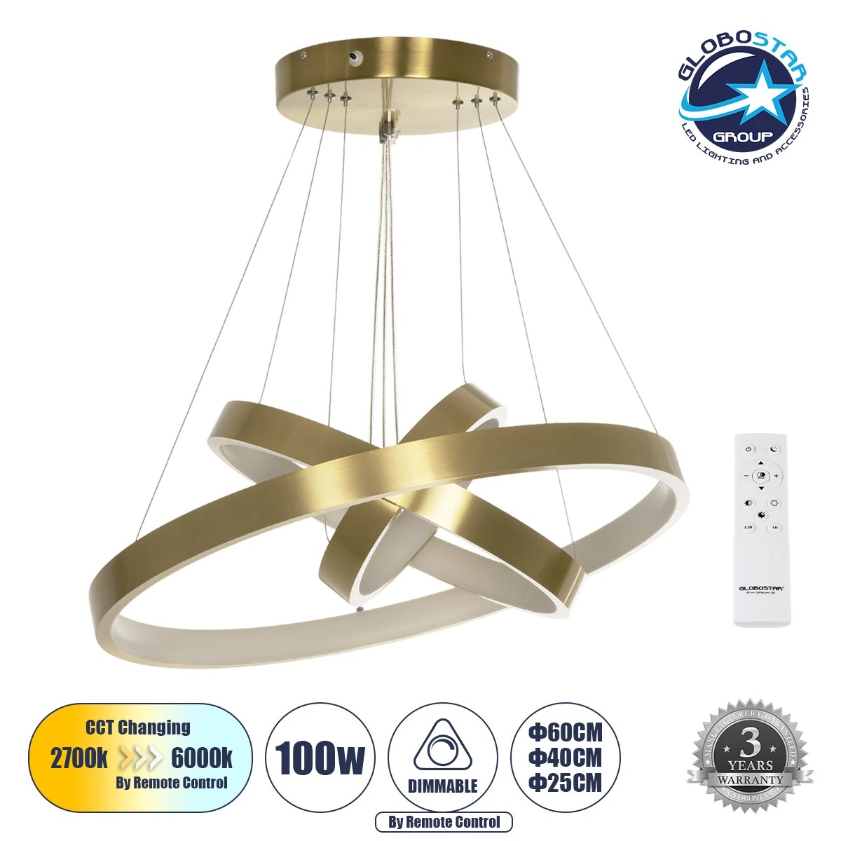 GLOBOSTAR® NEMESIS TRIO 61169-DECO Μοντέρνο Κρεμαστό Φωτιστικό Οροφής LED 100W 12123lm 360° AC 220-240V IP20 Ρυθμιζόμενο Λευκό CCT με Χειριστήριο από 2700K έως 6000K Dimmable – Lumileds SMD Chip – Χρυσό Βούρτσας – Μ60 x Π60 x Υ60cm – 3 Χρόνια Εγγύηση