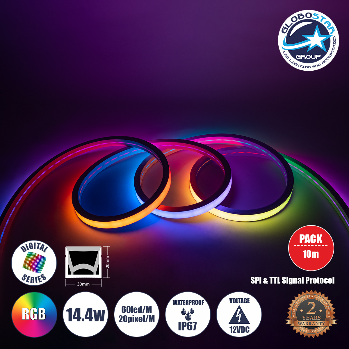 GLOBOSTAR® NEONIO-B 90754 Ψηφιακή Pixel Addressable Ταινία Neon Flex LED 14.4W/m 864lm/m 90° DC 12V Αδιάβροχο IP65 60 x SMD5050 Chip/m 20 x Pixel/m Πολύχρωμο RGB Dimmable SPI/TTL Protocol IC SM16703P/WS2811/WS2812 – Sanan SMD Chip – Μ1000 x Π3 x Υ2cm – Ρολό 10 Μέτρων – 3 Χρόνια Εγγύηση