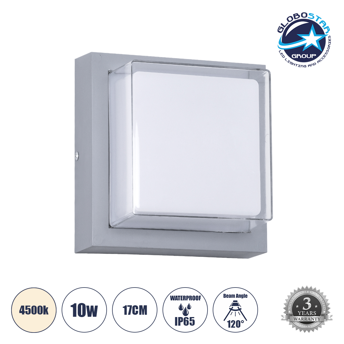 GLOBOSTAR® NEXUS 60768 Μοντέρνο Φωτιστικό Τοίχου – Απλίκα LED 10W 1050lm 120° AC 220-240V Αδιάβροχο IP65 Φυσικό Λευκό 4500K – Bridgelux SMD Chip – Γκρι – Μ17 x Π17 x Υ9cm – 3 Χρόνια Εγγύηση