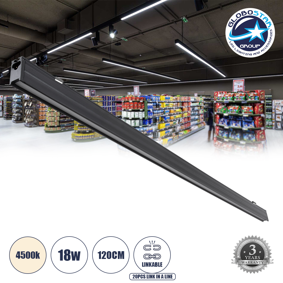 GLOBOSTAR® OFFICE 61024 Μοντέρνο Γραμμικό Επεκτεινόμενο Φωτιστικό Οροφής LED 18W 2200lm 120° AC 220-240V IP20 Φυσικό Λευκό 4500K – Lumileds SMD Chip – Μαύρο Ματ – Μ120 x Π2 x Υ4cm – 3 Χρόνια Εγγύηση