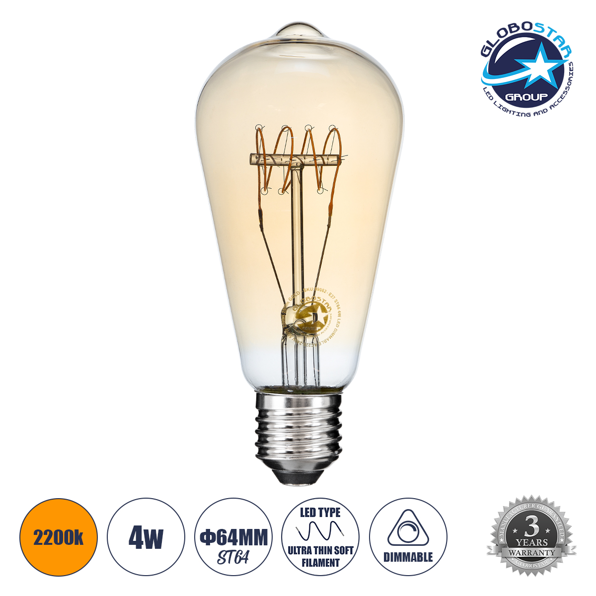 GLOBOSTAR® PEAR 99082 Λάμπα E27 ST64 LED 4W 280lm 360° AC 220-240V IP20 Ultra Θερμό Λευκό 2200K Dimmable – Ultra Thin Soft T Spiral Filament Chip – Μελί – Μ6.4 x Π6.4 x Υ14cm – 3 Χρόνια Εγγύηση