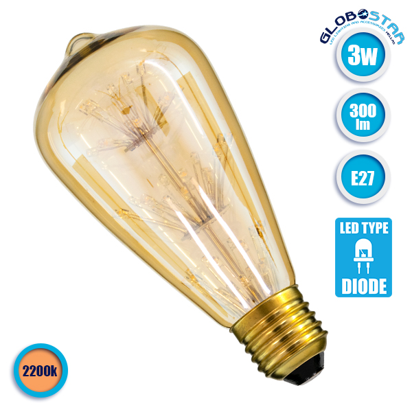 GLOBOSTAR® PEAR 99202 Λάμπα E27 ST64 LED 3W 300lm 360° AC 220-240V IP20 Ultra Θερμό Λευκό 2200K – Diode HP Filament Chip – Μελί – Μ6.4 x 6.4 x Υ14.5cm – 3 Χρόνια Εγγύηση