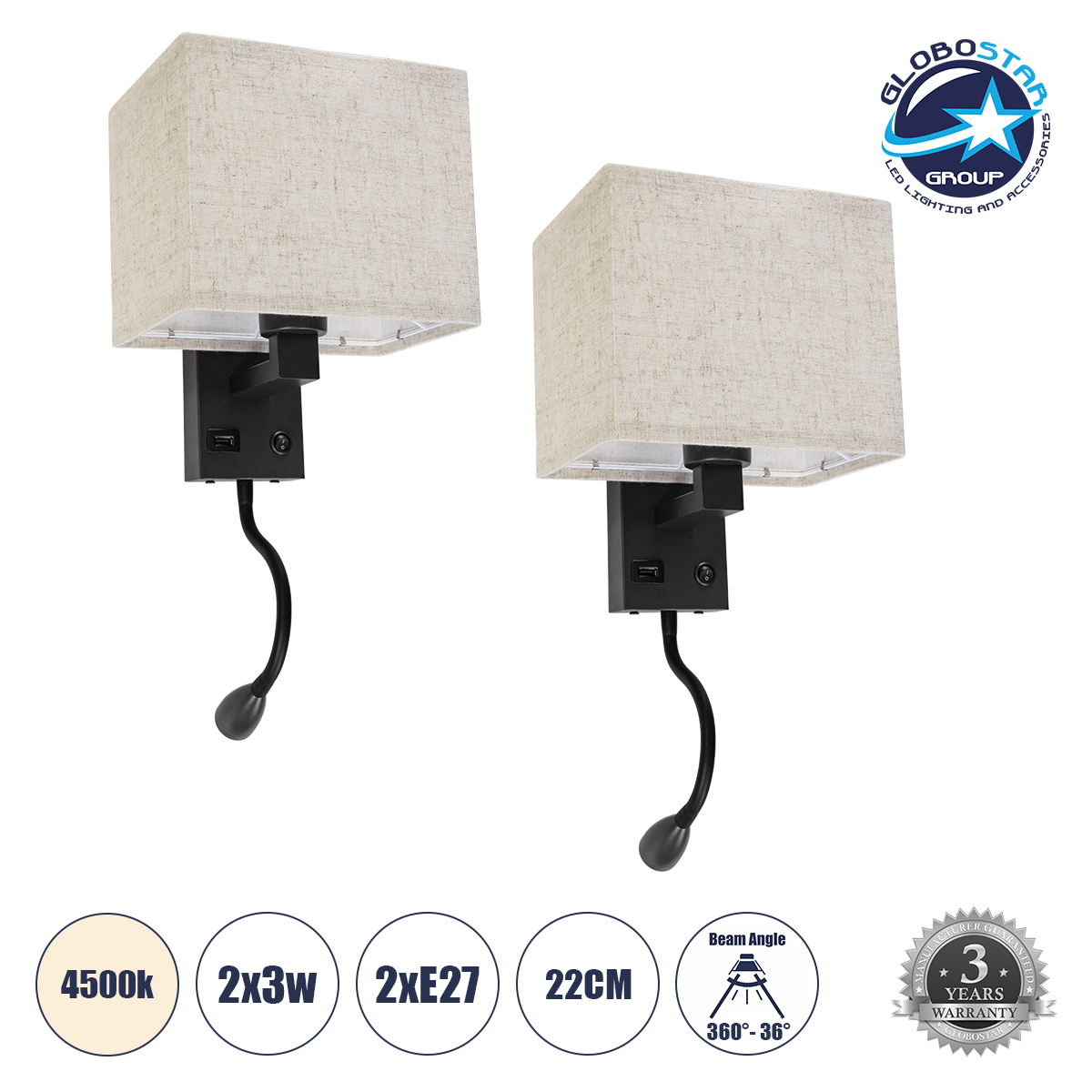 GLOBOSTAR® ROULETTE-S 61382 Μοντέρνο Φωτιστικό Τοίχου – Απλίκα Ξενοδοχείου Reading Light με Φορτιστή USB 3A & Ντουί 1 x E27 LED 3W 360lm 36° & 360° AC 220-240V IP20 Φυσικό Λευκό 4500K – Bridgelux COB Chip & TÜV SÜD Driver – Μαύρο & Μπεζ – Μ17 x Π20 x Υ37cm – Σετ 2 Τεμαχίων – 3 Χρόνια Εγγύηση