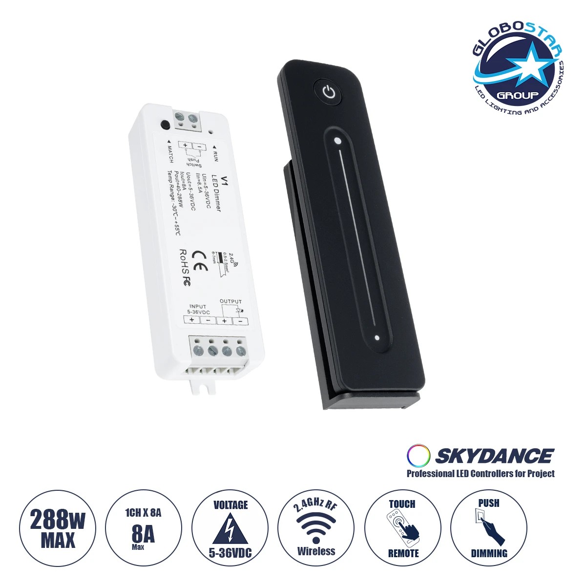 GLOBOSTAR® SKYDANCE-V1+R11 73119 DC RF 2.4Ghz Push Dimmer με RF Ασύρματο Χειριστήριο Αφής με 1 x 8A 288W Κανάλι DC 5-36V 8A 288W Max IP20 – RF 2.4Ghz & Push Dimming – Μ12.2 x Π5.3 x Υ1.7cm – 5 Χρόνια Εγγύηση